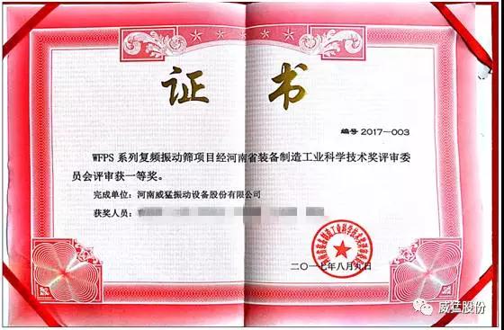 2017年威猛股份研發生產的“WFPS系列復頻振動篩項目”于2017年8月9日經河南省裝備制造工業科學技術獎評審委員會評審獲得一等獎。該獎項的獲得是對威猛股份的產品及研發能力的肯定。