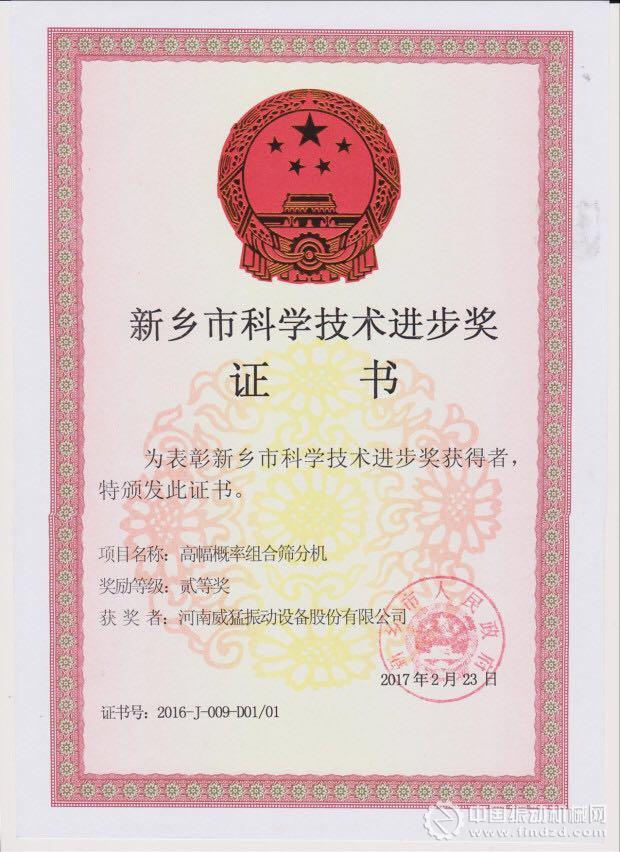 河南威猛振動新一代技改升級產品高幅概率組合篩分機于2017年2月23日獲新鄉市人民政府頒發“新鄉市科學技術進步獎貳等獎”證書,該獎項的獲得是對公司產品技改升級成果的肯定。