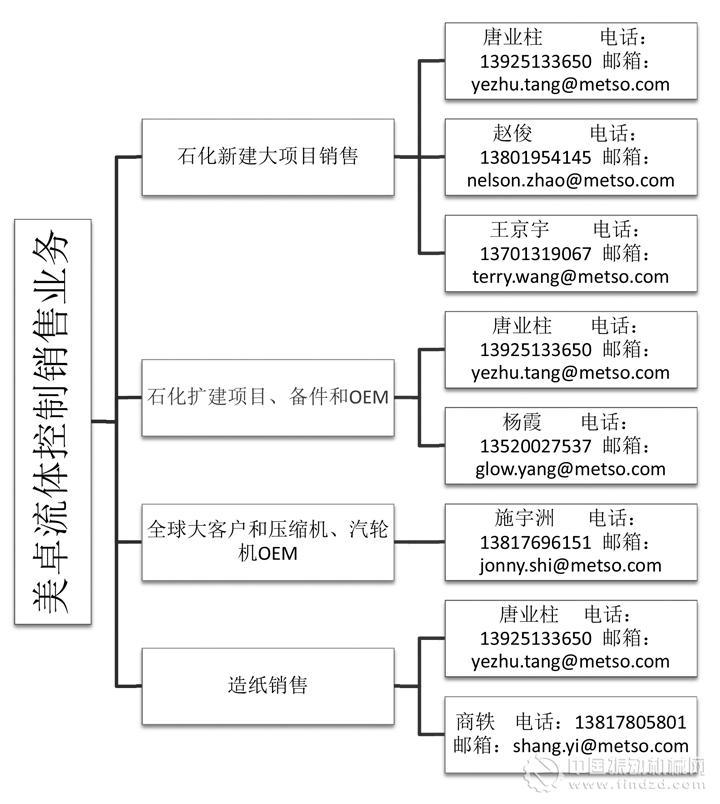為了適應中國業務不斷壯大發展的需要,自2018年1月1日起美卓流體控制(上海)有限公司對銷售組織結構進行了調整,現將美卓流體控制業務分為石化新建大項目銷售、造紙銷售、石化擴建項目和MRO備品備件銷售(技術改造,閥門更換,備品備件和服務)和全球大客戶、壓縮機和汽輪機OEM四大部分。具體銷售負責人及聯系方式如下: