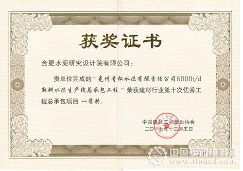 2、克州青松水泥有限責任公司6000t/d熟料水泥生產線總承包工程,獲優秀工程總承包項目一等獎;