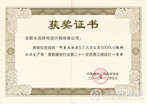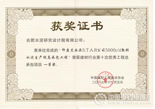 1、印度尼西亞S.T.A.R公司5000t/d熟料水泥生產線總承包工程,獲優秀工程總承包項目一等獎;