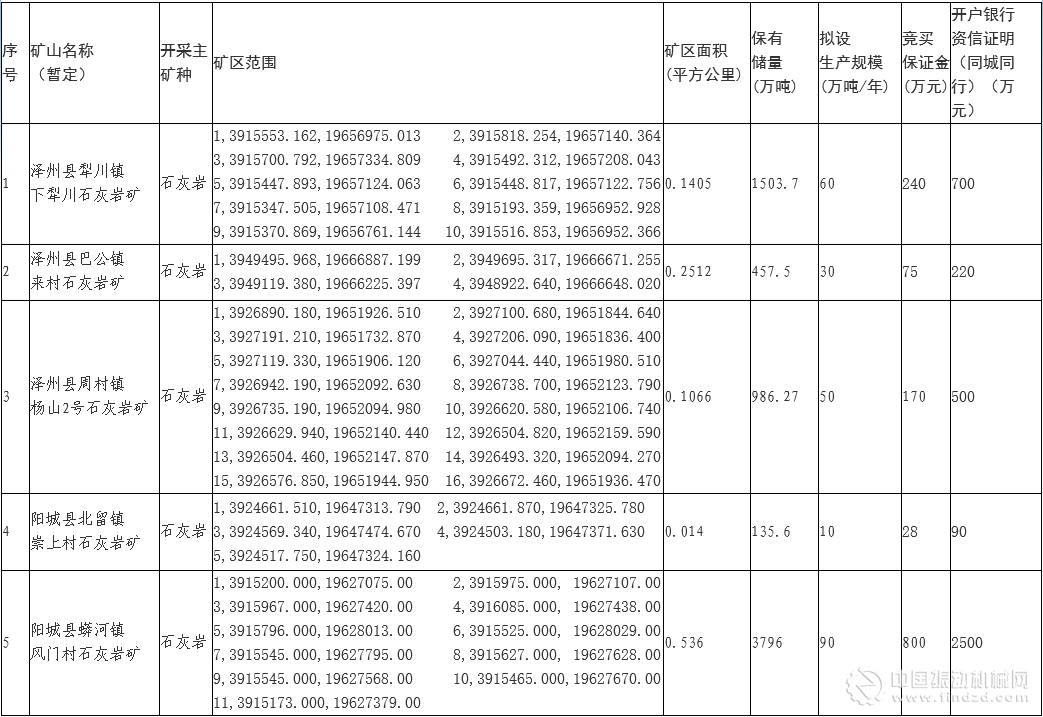 根據山西省國土資源廳《關于晉城市礦業權設置方案的批復》(晉國土資函〔2013〕1111號)和《關于調整晉城市礦產資源規劃有關問題的函》(晉國土資函〔2016〕134號)及各縣(市)國土資源局上報出讓計劃,經市人民政府批準,現擬定對澤州縣犁川鎮下犁川石灰巖礦等5宗非煤礦產采礦權進行公開出讓,有關事項公告如下:
