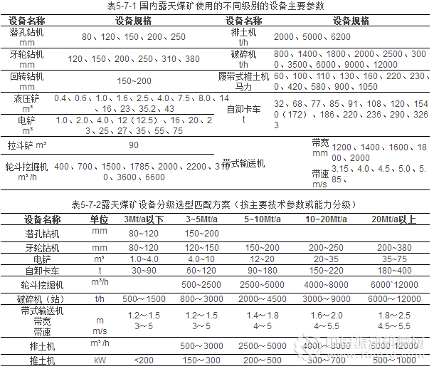 截至2013年底,國內露天煤礦使用的不同級別的設備主要參數見表5-7-1,露天煤礦設備分級選型匹配方案見表5-7-2。