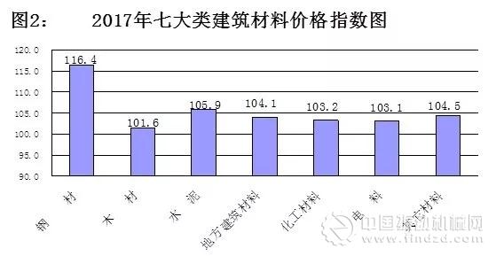 2017年,建筑安裝、裝飾工程中,材料費價格指數(shù)為109.6,同比上漲9.6%,漲幅比上年擴大13.0個百分點,拉動建安工程價格上漲6.0個百分點,影響總指數(shù)上漲4.7個百分點。從構成看,七大類建筑材料價格全部上漲(見圖2)。