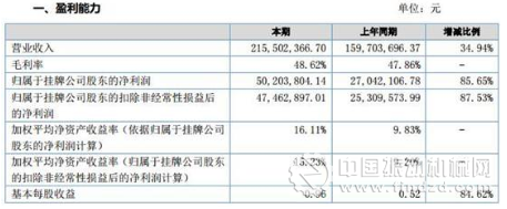 3月9日,耐普礦機發布2016年年報,報告期內,實現營收2.16億元,同比增長34.94%;歸屬于掛牌公司股東凈利潤5020.38萬元,同比增長85.65%?;久抗墒找?.96元。