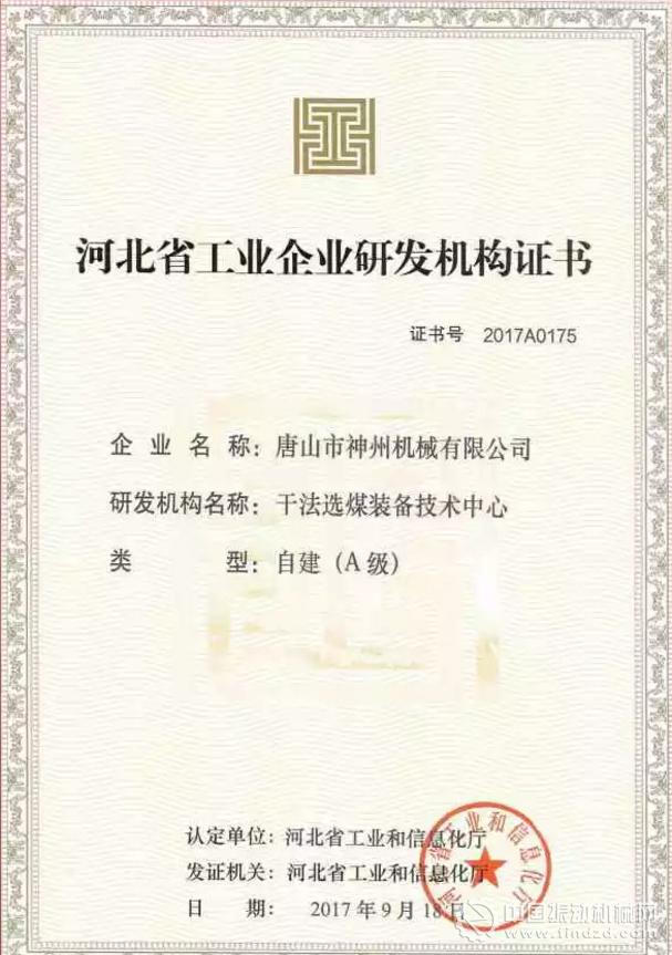 唐山神州機械公司干法選煤裝備技術中心被認定為河北省工業(yè)企業(yè)研發(fā)機構