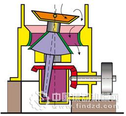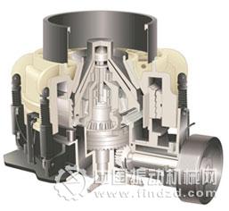 南方路機HC系列圓錐式破碎主機采用擠壓式破碎原理,物料在動錐襯板和定錐襯板內破碎腔體被破碎。動錐體在偏心軸上大齒輪和小齒輪驅動,偏心軸使得其在旋轉時動錐體可以擺動,物料在動定錐襯板之間被連續不斷地擠壓破碎,其它的破碎過程在物料相互摩擦中產生。具有以下幾大特征: