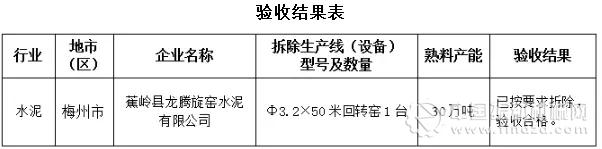 經縣、市、省級三級現場驗收和驗收結果公示,現將蕉嶺縣龍騰旋窯水泥有限公司拆除水泥(熟料)產能驗收合格予以通告。 通告全文如下: