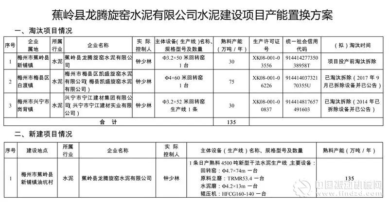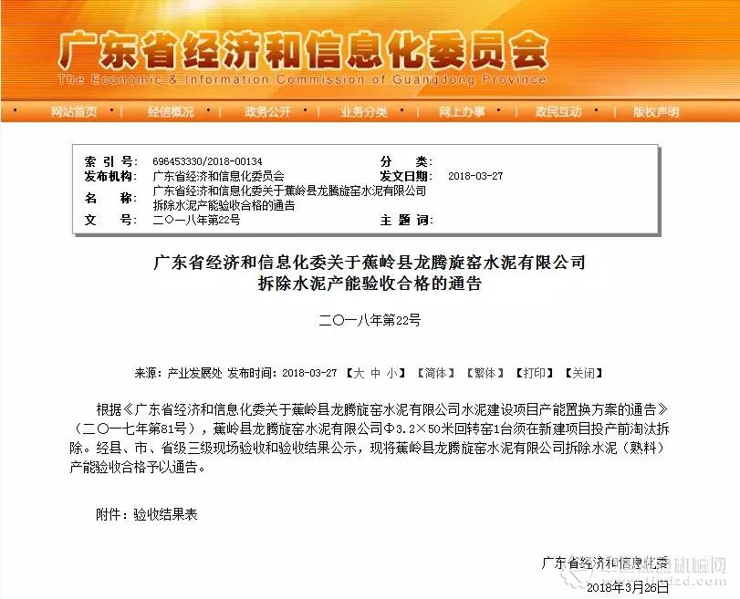 2018年3月26日廣東省經濟和信息化委發布《關于蕉嶺縣龍騰旋窯水泥有限公司拆除水泥產能驗收合格的通告》。通知指出:根據《廣東省經濟和信息化委關于蕉嶺縣龍騰旋窯水泥有限公司水泥建設項目產能置換方案的通告》蕉嶺縣龍騰旋窯水泥有限公司Φ3.2×50米回轉窯1臺須在新建項目投產前淘汰拆除。