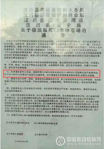 四川省汶川縣相關部門要求,3月31日之前23家非法砂石廠停止經(jīng)營活動,并于4月15日前拆除非法建筑物,自行清理相關設施和原料物資,實施生態(tài)恢復,并在6月底前取締第三批10家砂場!