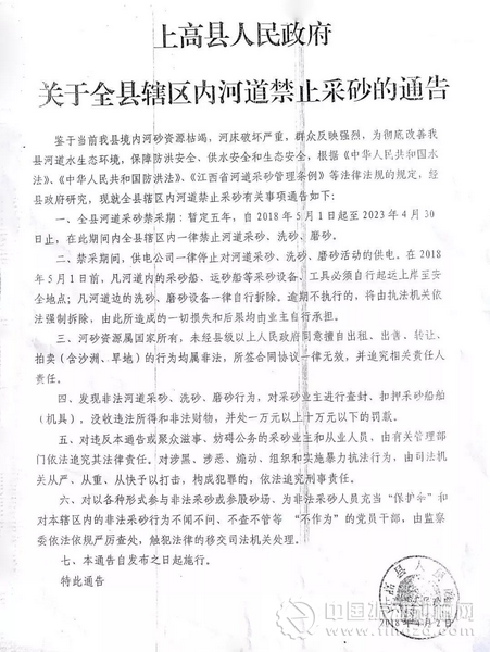 上高縣人民政府關于全縣轄區內河道禁止采砂的通告