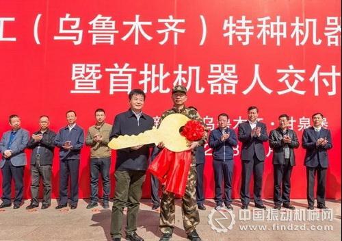 當天上午,烏魯木齊市政府在甘泉堡經濟技術開發區舉行了基地落成暨首批機器人交付儀式。烏魯木齊市領導郝建民、中信集團業務協同部副總經理唐萬元為基地落成揭牌。中信重工總經理王春民出席儀式并致辭,公司副總經理劉大華向公安消防部門交付象征開啟機器人的金鑰匙。甘泉堡經濟技術開發區黨工委副書記、管委會主任湯山主持儀式。