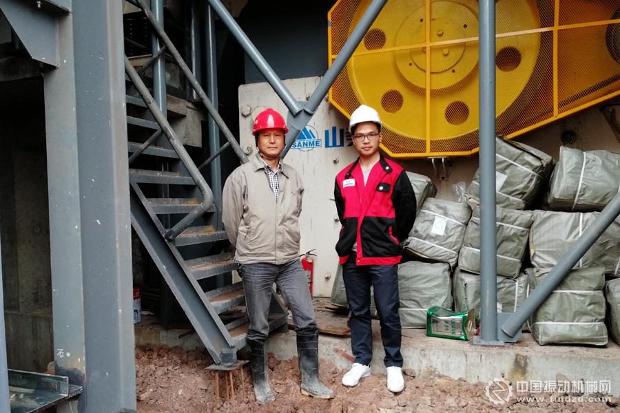 圖為:客戶與山美股份華東片區銷售負責人在山美股份JC顎式破碎機安裝現場合影