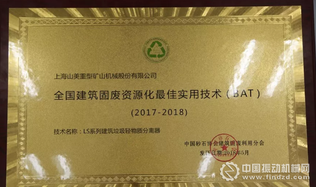 山美股份LS系列建筑垃圾輕物質(zhì)分離器還榮獲了協(xié)會頒發(fā)的2017-2018全國建筑固廢資源化最佳實用技術(shù)(BAT)獎,實至名歸。