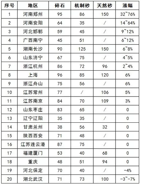 在以上20個地區砂石價格漲幅表中,11個城市砂石價格環比上漲,漲幅高達76%,天然砂報價高達150元/噸。