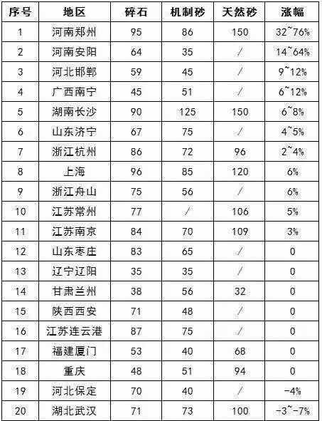 另附近期各地砂石骨料價格漲幅如下: