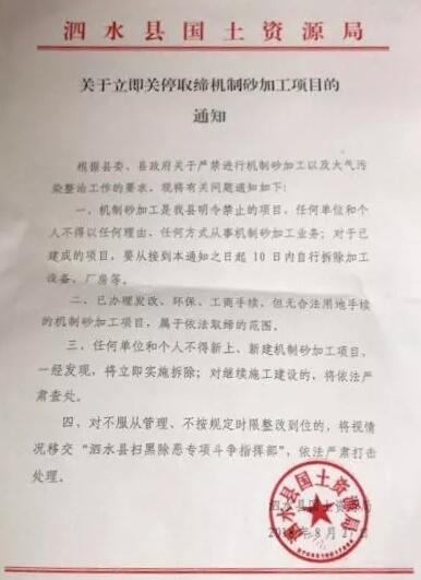 根據泗水縣委、縣政府關于嚴禁進行機制砂加工以及大氣污染整治工作的要求,現將有關問題通知如下: 一、機制砂加工是泗水縣命令禁止的項目,任何單位和個人不得以任何理由、任何方式從事機制砂加工業務;對于已建成的項目,要從接到通知之日起10日內自行拆除加工設備、廠房等。 二、已辦理發改、環保、工商手續,但無合法用地手續的機制砂加工項目,屬于依法取締的范圍。 三、任何單位和個人不得新上、新建機制砂加工項目,一經發現,將立即實現拆除;對繼續施工建設的,將依法嚴肅查處。 四、對不服從管理、不按規定時限整改到位的,將視情況移交“泗水縣掃黑除惡專項斗爭指揮部”,依法嚴肅打擊處理。