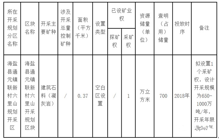 ① 新增“海鹽縣通元鎮聯新村六里山建筑用石料規劃開采區(KC1)”