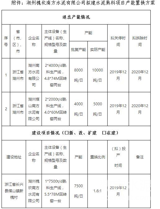 日前,浙江省經濟和信息廳發布了《湖州槐坎南方水泥有限公司7500噸/日熟料項目產能置換方案公告》。公告稱:按照《國務院關于化解產能嚴重過剩矛盾的指導意見》和《工業和信息化部關于印發鋼鐵水泥玻璃行業產能置換實施辦法的通知》(工信部原[2017]337號)要求,湖州槐坎南方水泥有限公司新建7500噸/日熟料項目產能置換方案經公示征求社會公眾意見后予以公告。