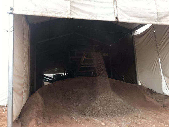 走進一座白色環保生產大棚內,三臺履帶式的大型機械——重型篩分機、破碎機、成品篩分機首尾相接,組成了一條建筑垃圾資源化處理生產線。整個生產車間只有兩三名工人在監視機械的運轉,進料口不斷被鏟車填滿,然后不斷“吞”下去。在大棚最外側的出料口,破碎、篩分完畢的四種不同粒徑規格再生骨料沿著履帶落在骨料堆上。