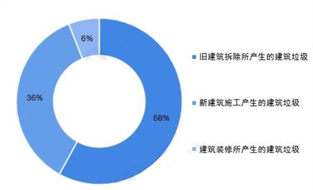 建筑垃圾的來源主要有三個方面:舊建筑拆除產生、新建筑施工產生以及建筑裝修產生。從2017年我國建筑垃圾的構成分布來看,舊建筑拆除所產生的建筑垃圾占建筑垃圾的58%,新建筑施工產生的建筑垃圾占36%。由此可見,建筑物的拆除階段和新建筑的施工階段是建筑垃圾的控制關鍵點。