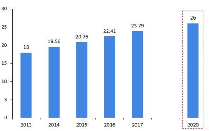 圖2 2013-2017年和2020年中國建筑垃圾的產量情況及預測(億噸)