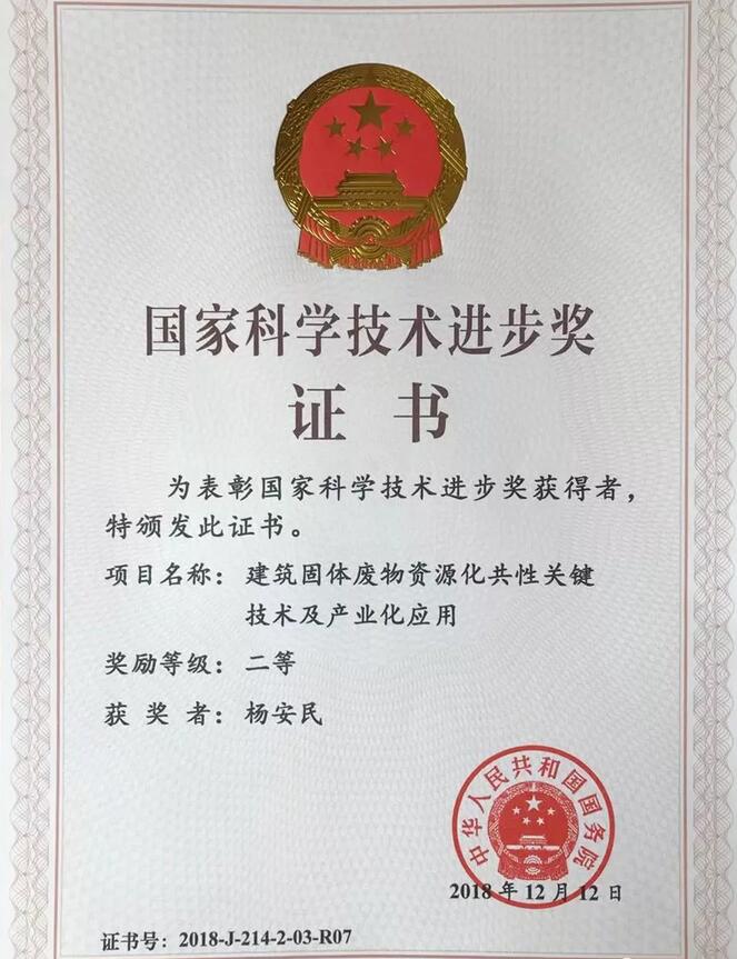 2019年1月8日上午,中共中央、國務院在北京隆重舉行國家科學技術獎勵大會,2018年度國家科學技術獎勵名單揭曉。由中國建筑材料聯合會提名,山美股份與同濟大學、北京建筑大學、青島理工大學、昆明理工大學、北京聯綠、許昌金科等成員單位共同參與完成的《建筑固體廢物資源化共性關鍵技術及產業化應用》(J-214-2-03)項目獲2018年度國家科學技術進步獎二等獎。