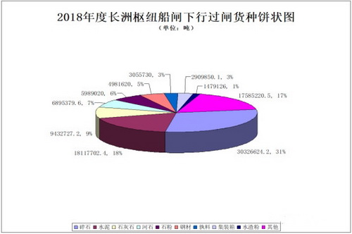 據統計,2018年長洲樞紐船閘下行過閘貨物通過量為10077.3萬噸,同比增長50.5%,其中增幅較大的貨種有碎石和石灰石等,增幅分別為98.3%和92.7%;上行過閘貨物通過量為3101.9萬噸,同比下降2.5%,其中砂209.3萬噸,同比下降60.0%,其他貨種相對平穩。