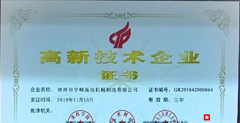 鐘祥市宇峰振動機(jī)械制造有限公司就是新增的27家國家高新技術(shù)企業(yè)之一,該公司生產(chǎn)的各類振動篩選機(jī)、振動給料機(jī)等各類振動機(jī)械,在產(chǎn)品質(zhì)量、節(jié)能環(huán)保等方面受到客戶的青睞,目前該公司取得的各類振動機(jī)械實用新型專利證書達(dá)到十多項。