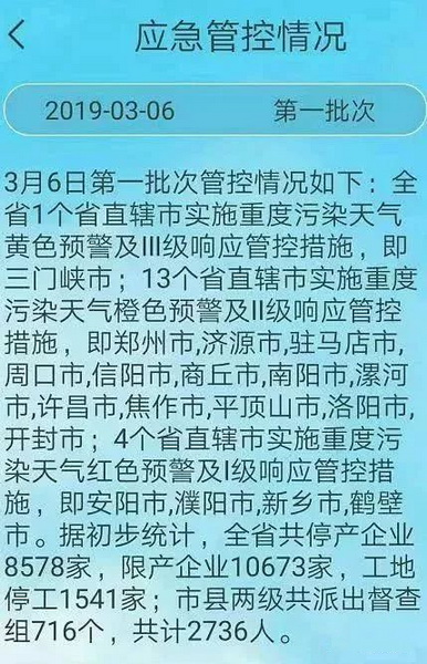 據初步統計,河南全省共停產企業8578家,限產企業10673家,工地停工1541家;市縣兩級共派出督查組716個,共計2736人。