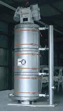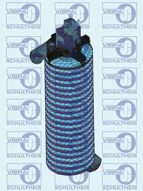 在動(dòng)態(tài)條件的理論試驗(yàn)中,線性輸送機(jī)的動(dòng)能和加速度被振動(dòng)螺旋提升機(jī)的轉(zhuǎn)動(dòng)慣量和角加速度所取代。所有部件的設(shè)計(jì)都是根據(jù)重量荷載的變化,通過(guò)有限元模型計(jì)算應(yīng)力分析證實(shí)。下圖是振動(dòng)螺旋提升機(jī)模型的結(jié)構(gòu)。其尺寸設(shè)計(jì)要根據(jù)被輸送物料的輸送量,工藝應(yīng)用要求的熱傳輸面積以及規(guī)定的/允許的高度。在設(shè)計(jì)階段工程師需要特別注意螺旋輸送塔的扭轉(zhuǎn)力和彎曲剛度。最常用的變量是輸送機(jī)的直徑在500mm到1500mm,輸送高度在1m到7m之間。直徑為1500mm輸送槽的物料輸送能力可到30 立方米每小時(shí)。振動(dòng)螺旋提升機(jī)對(duì)現(xiàn)代散料處理技術(shù)的重要性就是:一、保證衛(wèi)生,易于清洗;二、可以將輸送和工藝處理很好的結(jié)合起來(lái)。