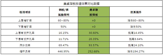 結果顯示,相比于3#振動篩鋼板或聚氨酯篩網50-60%的堵礦率,美卓篩板的篩孔幾乎是0堵礦。按照現場-3mm取料稱重,美卓橡膠篩板的篩分效率可達到93.57%,比國產篩網提高了24.10%。