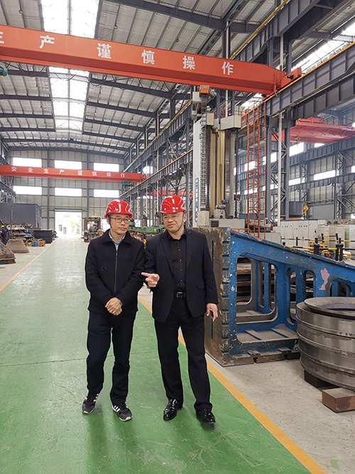 中國鐵建特種裝備事業部副總經理、綠色建材裝備研究設計院院長王金鋒與海興機械王總經理交談