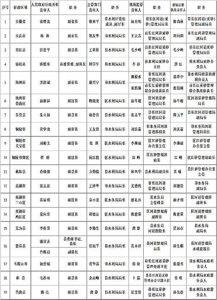 為了促進長江采砂管理工作,有效落實長江采砂管理責任制,安徽省明確了采砂管理省、市、縣人民政府行政首長責任人、水行政主管部門責任人、現場監管責任人和行政執法責任人名單。