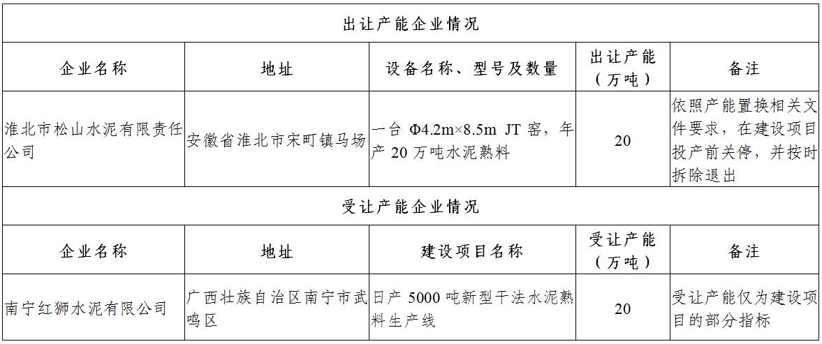 根據《國務院關于化解產能嚴重過剩矛盾的指導意見》(國發〔2013〕41號)和《工業和信息化部關于印發鋼鐵水泥玻璃行業產能置換實施辦法的通知》(工信部原〔2017〕337號)等文件,現將淮北市松山水泥有限責任公司一條Φ4.2m×8.5m JT窯水泥熟料生產線產能跨省出讓情況予以公告,歡迎社會公眾進行監督。