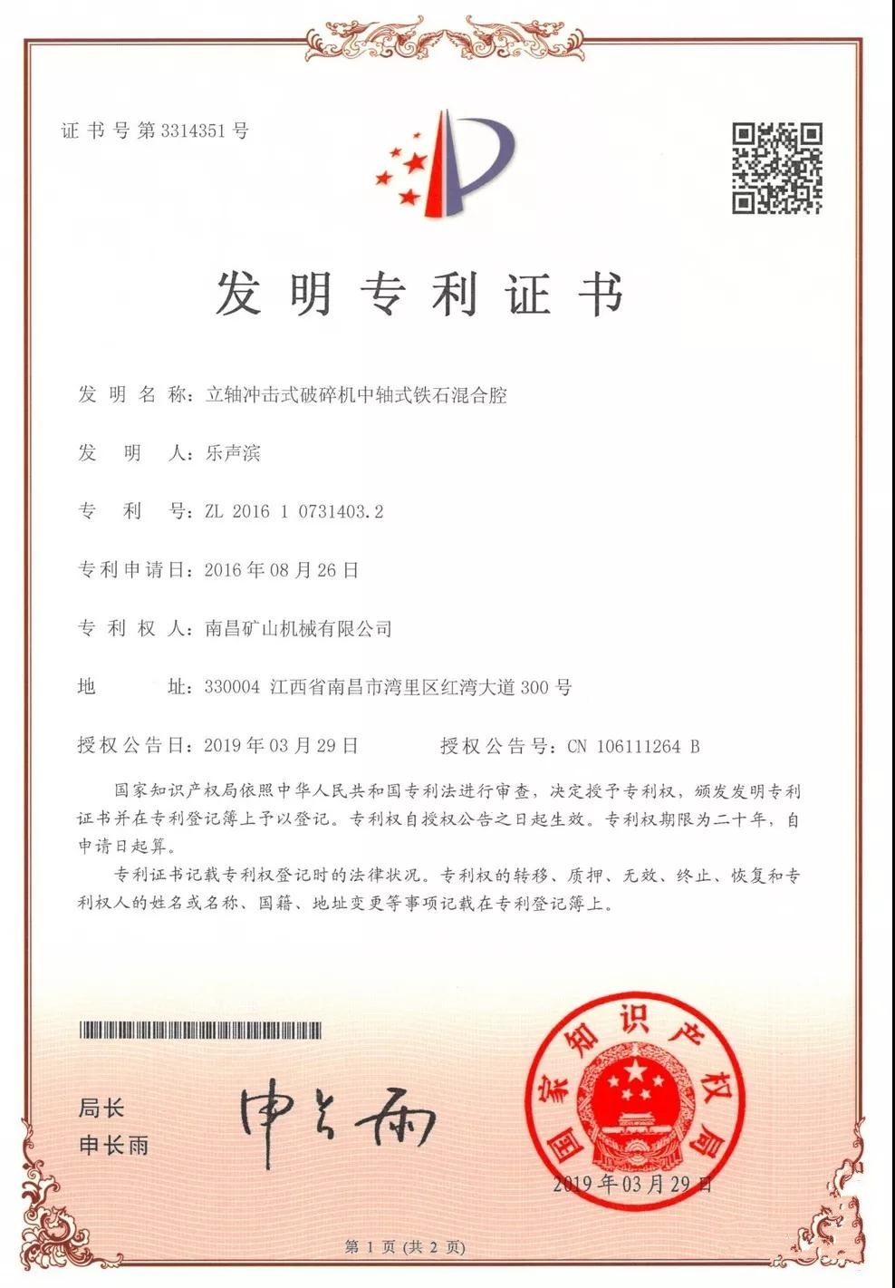 日前,南昌礦機(jī)一項(xiàng)發(fā)明專利獲得國(guó)家知識(shí)產(chǎn)權(quán)局授權(quán),此項(xiàng)專利名稱為《立軸沖擊式破碎機(jī)中軸式鐵石混合腔》,專利號(hào)為ZL 2016 1 0731403.2。證書上發(fā)明人一欄中“樂(lè)聲濱”三個(gè)字赫赫在目,腦海中不禁浮現(xiàn)了這位在破碎篩分領(lǐng)域奮斗十多年的前輩的身影,不禁浮現(xiàn)了南昌礦機(jī)百折不撓的研究團(tuán)隊(duì)的身影。