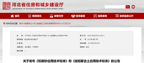 2019年4月23日,河北省住房和城鄉建設廳發布公告,河北省地方標準——《機制砂應用技術標準》正式發布,8月1日起實施。