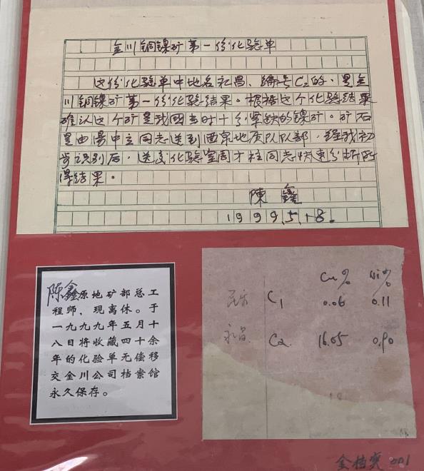 時任地質部總工程師的陳鑫了解情況后,敏銳的察覺到:礦石中是否會含有鎳元素?他叮囑,要做針對鎳元素的分析。幾天后,金川銅鎳礦床的第一份礦石標本分析報告出爐:鎳含量0.90%、銅含量16.05%。鎳元素真的存在!那一刻,宛若點石成“鎳”,西北風拂過的戈壁灘變得熠熠生輝。