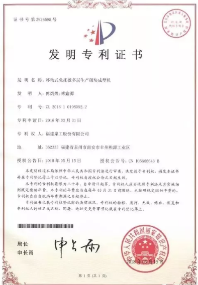 4月27日—5月8日,第118屆巴黎國際發明展覽會在法國巴黎市凡爾賽門國際展覽中心舉行,展覽會有來自23個國家和地區的542項發明項目參加。福建泉工股份有限公司申報的“一種智能移動式免托板多層生產砌塊成型機設備”,在眾多參評發明中脫穎而出,榮獲金獎。