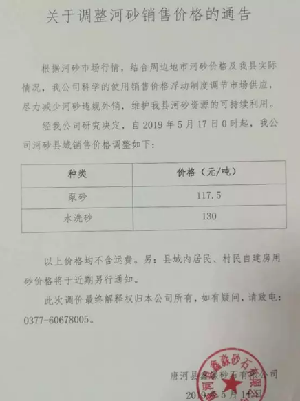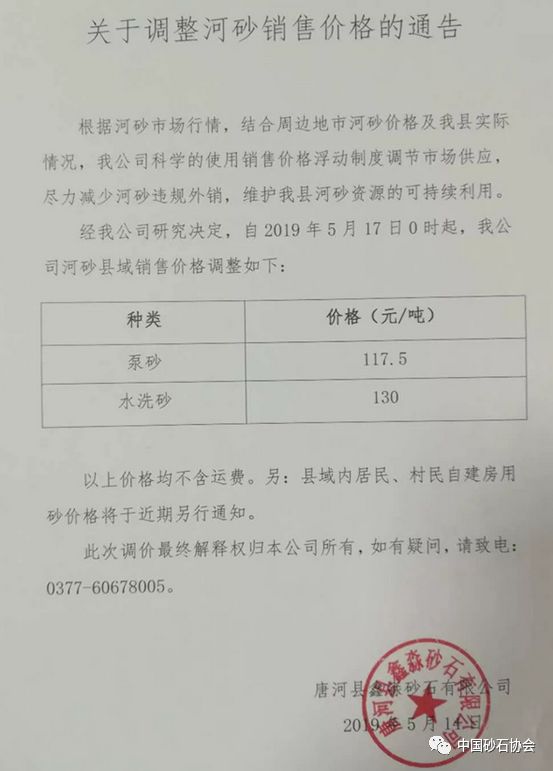 河南省唐河縣鑫淼砂石有限公司2019年5月14日發布《關于調整河砂銷售價格的通告》,自2019年5月17日0時起,該公司河砂縣域銷售價格調整如下:泵砂117.5元/噸,水洗砂130元/噸。并要求盡力減少河砂違規外銷,維護河砂資源的可持續利用。