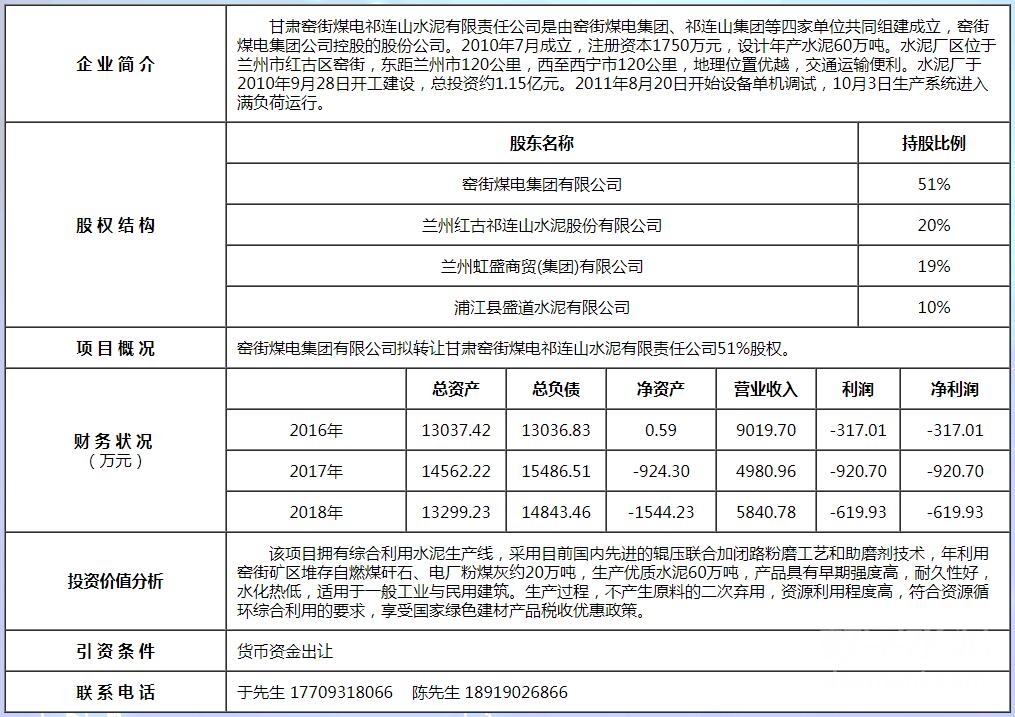 甘肅窯街煤電祁連山水泥有限責任公司51%股權轉讓項目推介公告