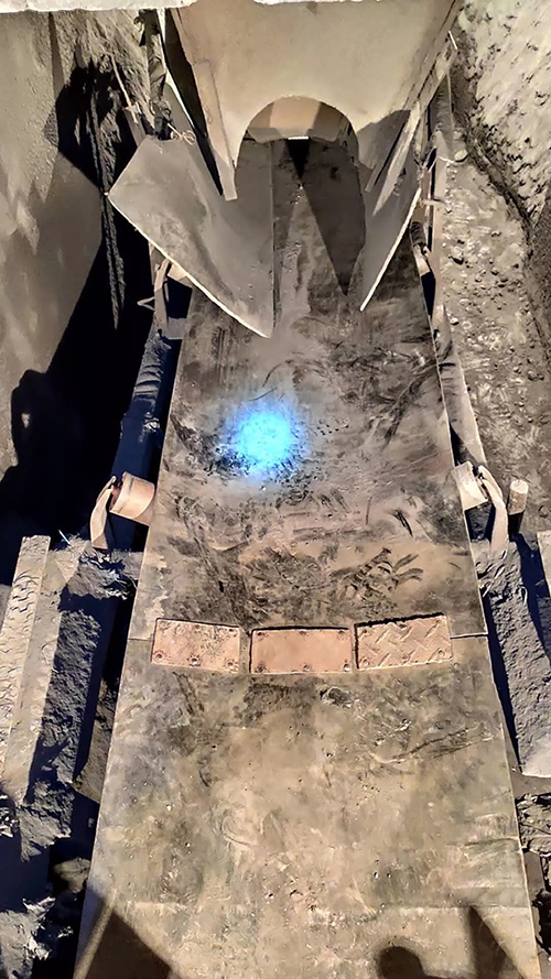 5月13日深夜00:00,選礦車間破碎反擊式破碎機(jī)4#皮帶漏斗邊板磨損脫落,造成4#皮帶撕毀,不能再使用,必須馬上對接更換皮帶,否則無法確保夜班原礦正常供給。