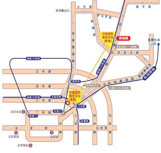 乘坐地鐵2號線至東直門站(或地鐵10號線至芍藥居站),換乘地鐵13號線至望京西站,換乘地鐵15號線,至國展(A口出),步行至展館。