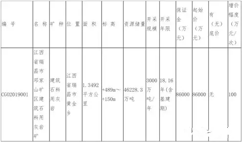 日前,自然資源部網站轉發瑞昌市礦產資源儲備交易中心發布的《瑞昌市礦業權出讓網上掛牌公告》,顯示,江西省瑞昌市鄧家山礦區建筑石料用灰巖礦業權正在掛牌出讓,開采規模3000萬噸每年,開采年限為18.16年(含基建期),起始價8.6億元。