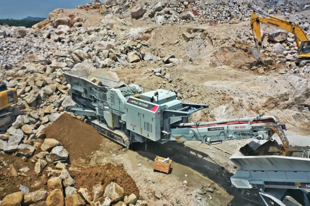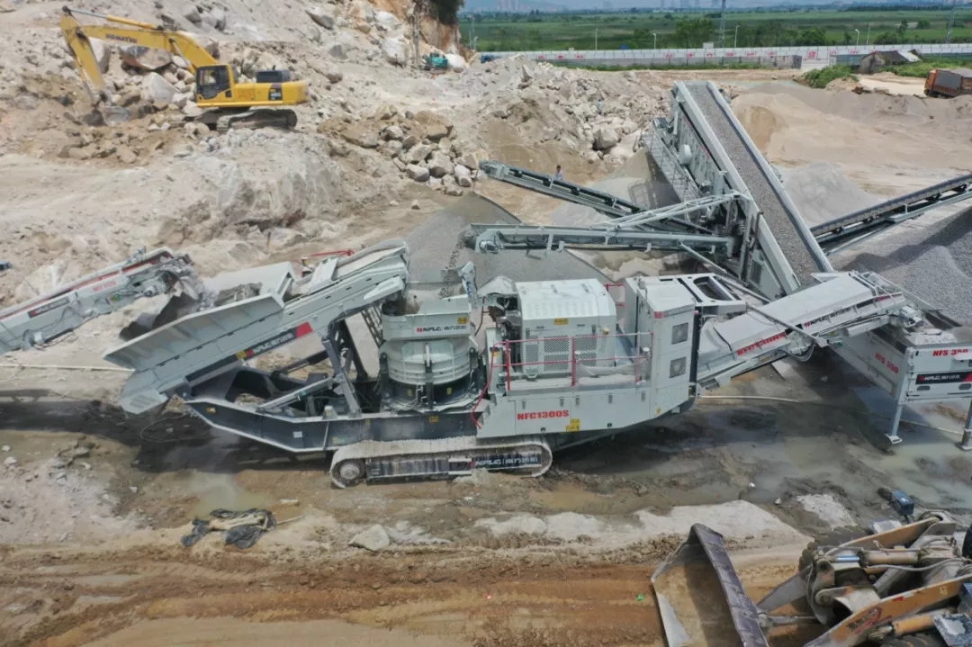 該生產線由南方路機履帶移動顎式破碎機NFJ1175,履帶移動圓錐式破碎機NFC1300S、履帶移動傾斜式篩分機NFS350,再配套挖機和裝載機等組成。