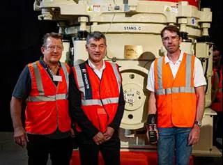圖注:VINCI集團子公司Eurovia今天在馬孔接收了第10,000臺HP圓錐破碎機。從左至右為Vincent Follet、Didier Thevenard 和Eric Guelton。