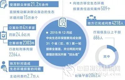 受理群眾舉報21.2萬余件,直接推動解決群眾身邊的生態環境問題15萬余個;立案處罰4萬多家,罰款24.6億元;立案偵查2303件,行政和刑事拘留2264人;地方針對造成生態環境損害的問題,主動問責約2.7萬人。