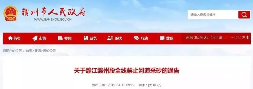 4月16日,江西贛州市人民政府發布《關于贛江贛州段全線禁止河道采砂的通告》,要求贛江贛州自5月1日起全線停止采砂。禁采區范圍內嚴禁任何單位和個人從事任何形式的河道采砂活動。