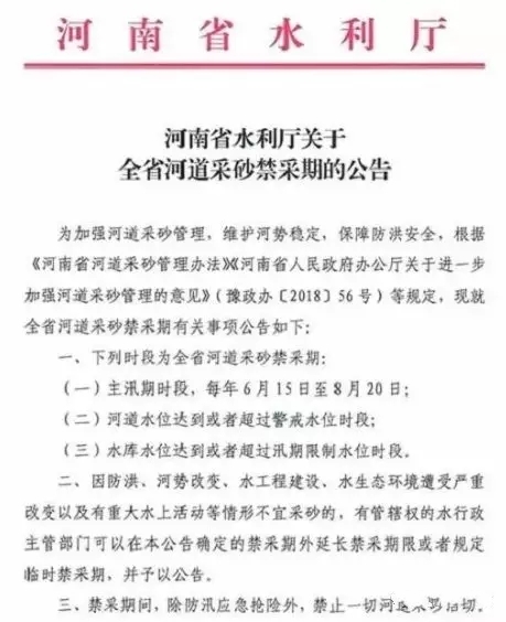 河南省水利廳發布《關于全省河道采砂禁采期的公告》,要求主汛期(6月15日至8月20日)禁止一切河道采砂活動。