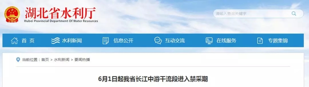 6月1日起,湖北省長江中游干流段進入禁采期,根據2019年湖北省政府發布的《關于加強河道采砂管理禁采的通告》,禁采為期4個月,至9月30日止,相應河道水位超警戒水位時,也要禁采。
